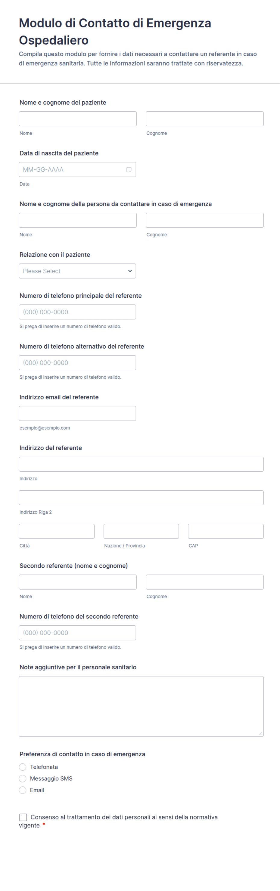 I campi tipici includono il nome, la relazione, il numero di telefono e l'indirizzo email dei contatti di emergenza, così come qualsiasi informazione medica rilevante o istruzioni speciali.