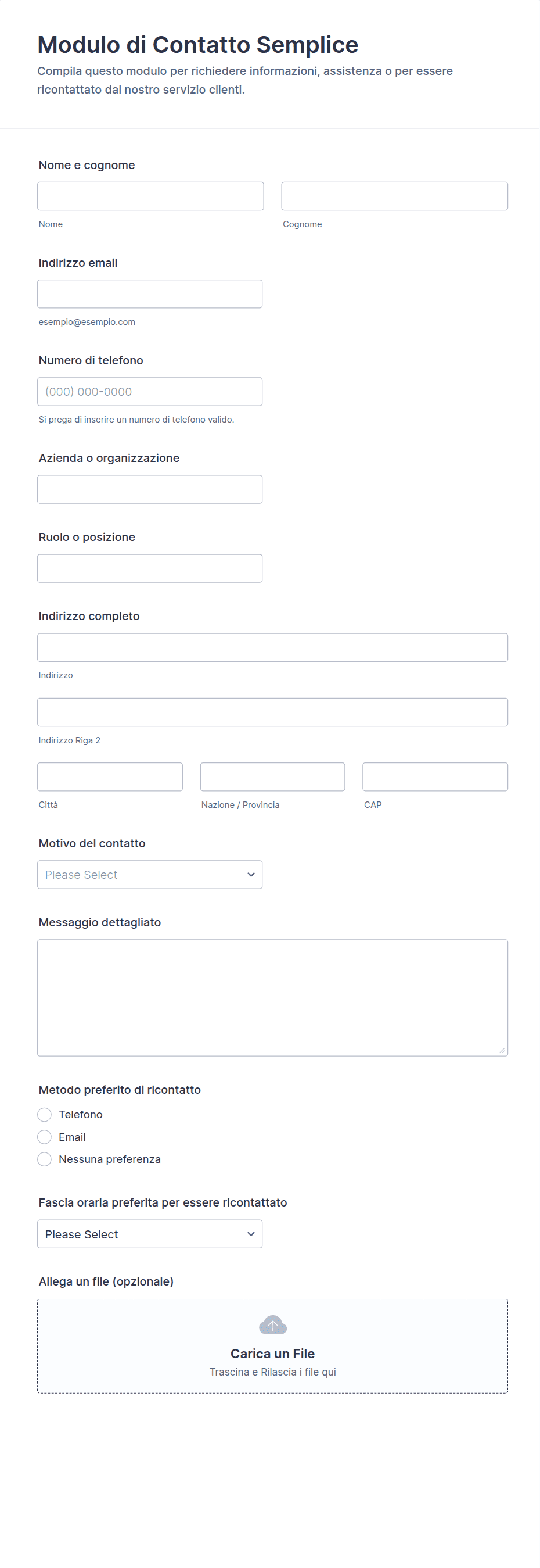 Raccogli richieste dal tuo sito con il Modulo di Contatto Semplice, utile per aziende, professionisti e organizzazioni che vogliono gestire comunicazioni in ingresso e raccolta dati con Jotform.