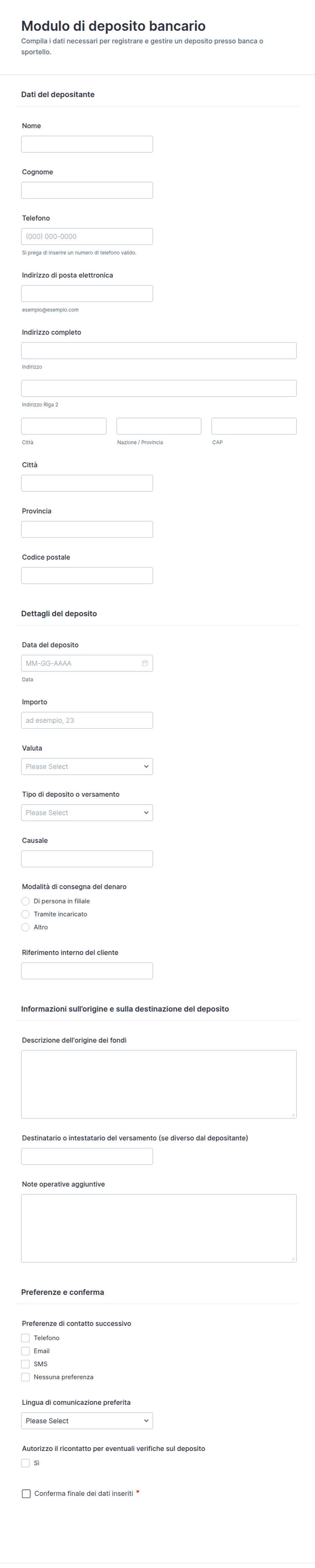 Un modello di modulo bancario è un modulo digitale già pronto, utilizzato dalle istituzioni finanziarie per raccogliere, elaborare e gestire informazioni relative ai servizi bancari, come apertura di conti, richieste di prestiti e verifiche di conformità.