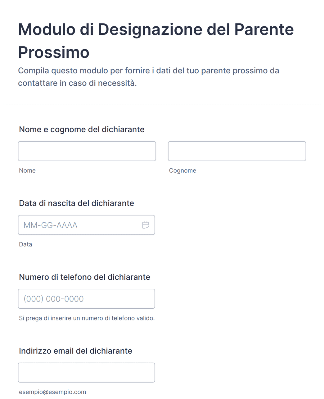 - Campi aggiuntivi in base all'utilizzo (es. dettagli di pagamento, informazioni mediche, contatti di emergenza).