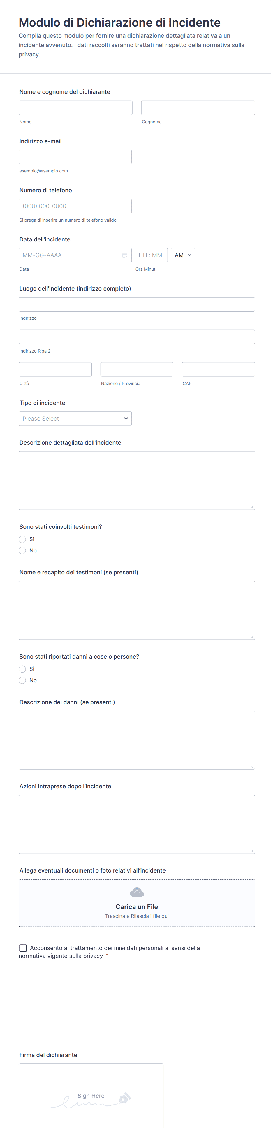 Un modulo di segnalazione incidenti è un documento strutturato utilizzato per registrare i dettagli su eventi inaspettati, incidenti o quasi incidenti in vari contesti. Aiuta le organizzazioni a documentare cosa è successo, chi è stato coinvolto e quali azioni sono state intraprese.