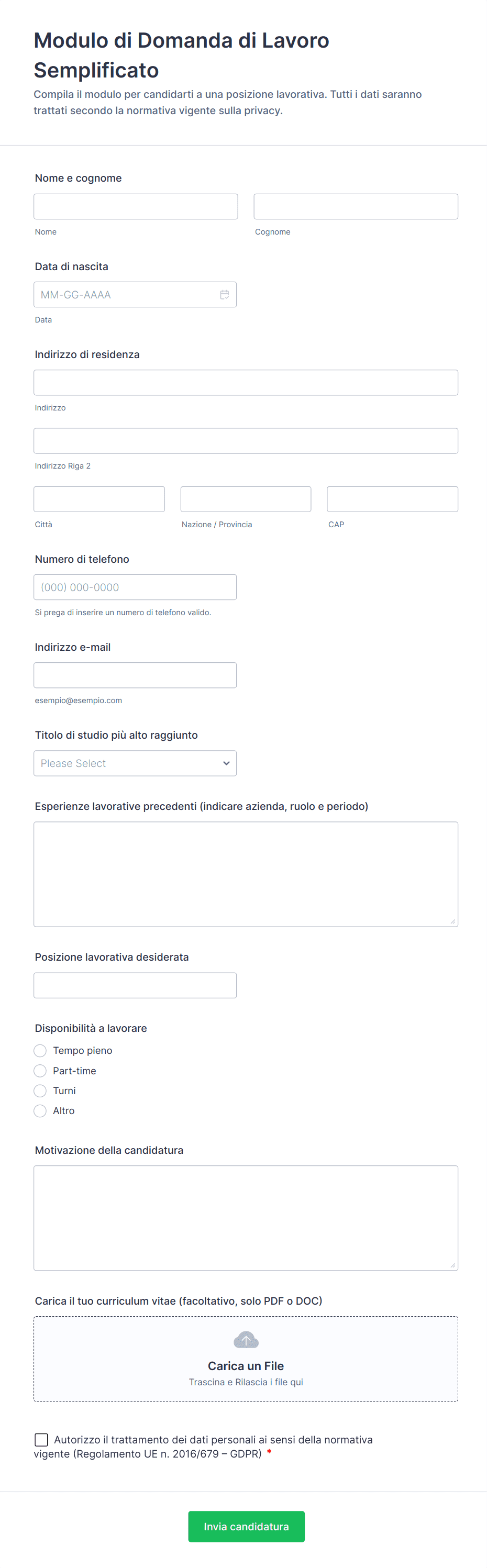 I moduli di domanda di lavoro sono strumenti essenziali utilizzati dalle organizzazioni per raccogliere informazioni standardizzate dai candidati in cerca di lavoro. Questi moduli semplificano il processo di assunzione raccogliendo informazioni chiave come dati personali, storia lavorativa, istruzione, competenze e referenze in modo organizzato. I moduli di domanda di lavoro possono essere personalizzati per una varietà di ruoli e settori, dalle posizioni entry-level a quelle dirigenziali, e sono comunemente utilizzati da dipartimenti delle risorse umane, agenzie per il lavoro e reclutatori per selezionare e valutare efficacemente i candidati. Che si tratti di posizioni a tempo pieno, part-time, stage o da remoto, i moduli di candidatura contribuiscono a garantire che tutte le informazioni necessarie vengano raccolte per una valutazione equa ed efficace dei candidati.