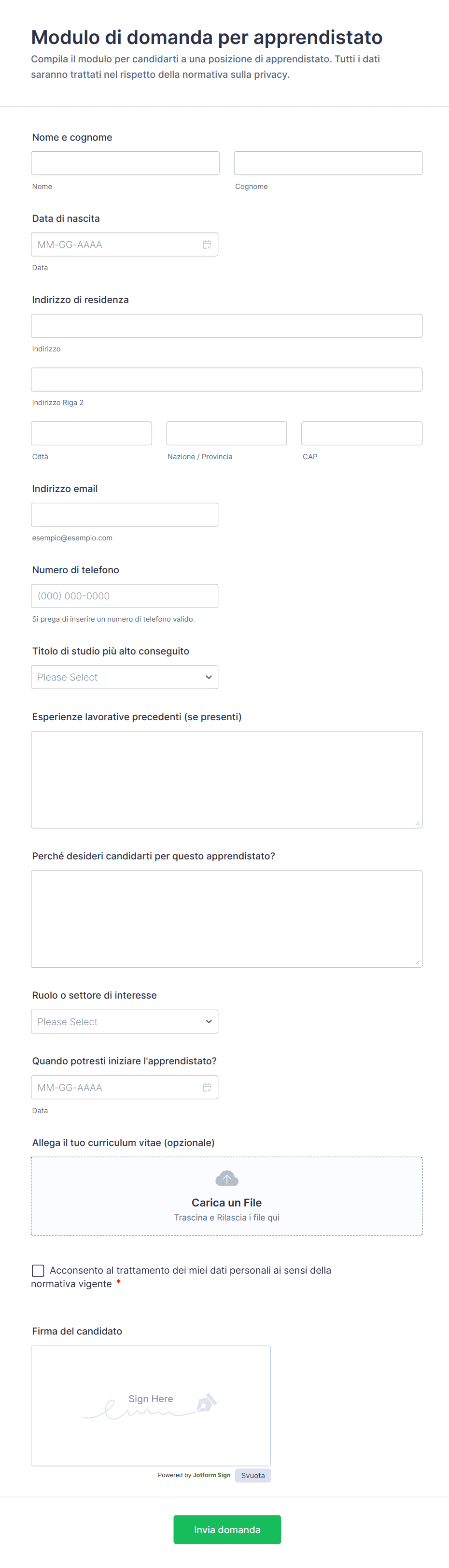 Sì, la maggior parte dei modelli include campi per il caricamento di file per curriculum, lettere di presentazione, trascrizioni o altri documenti richiesti.