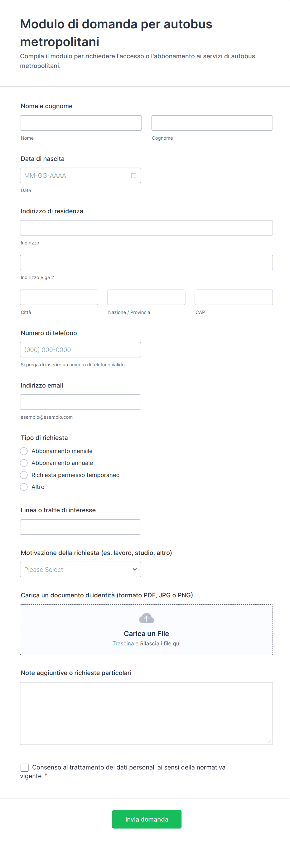 Questi moduli sono utili per aziende, scuole, fornitori di servizi sanitari, organizzatori di eventi, aziende di logistica e individui che necessitano di trasporti organizzati.