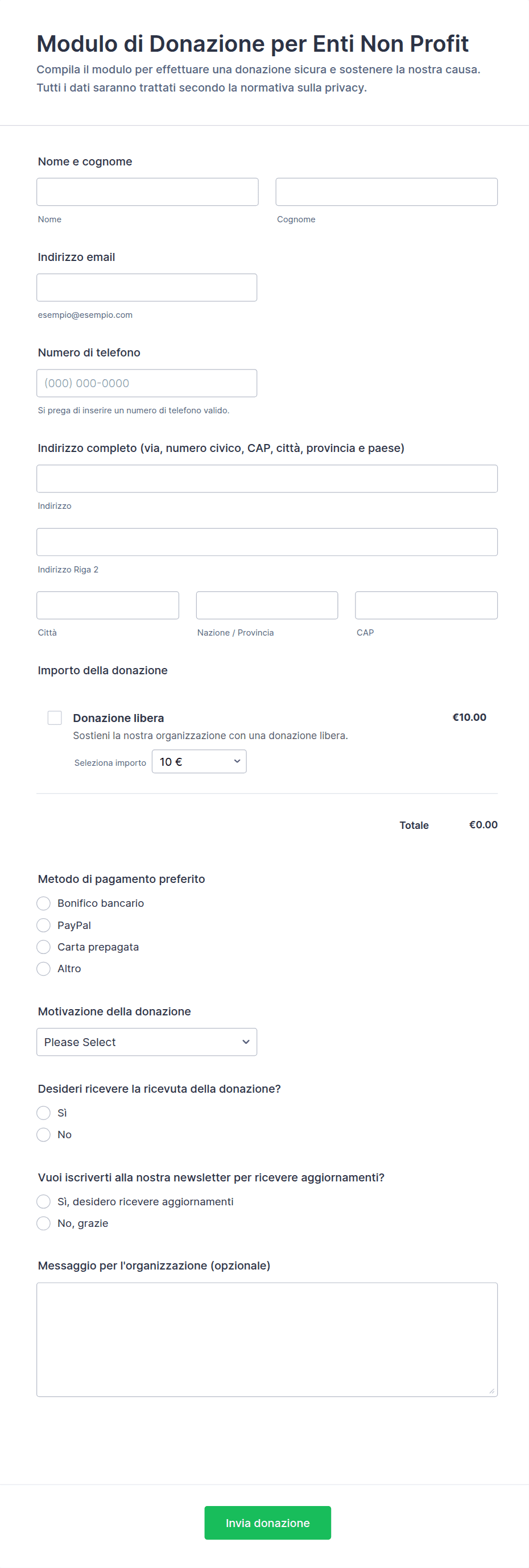 • Moduli per Donazioni Generiche: si concentrano sui dati del donatore, sull'importo della donazione e sul metodo di pagamento.