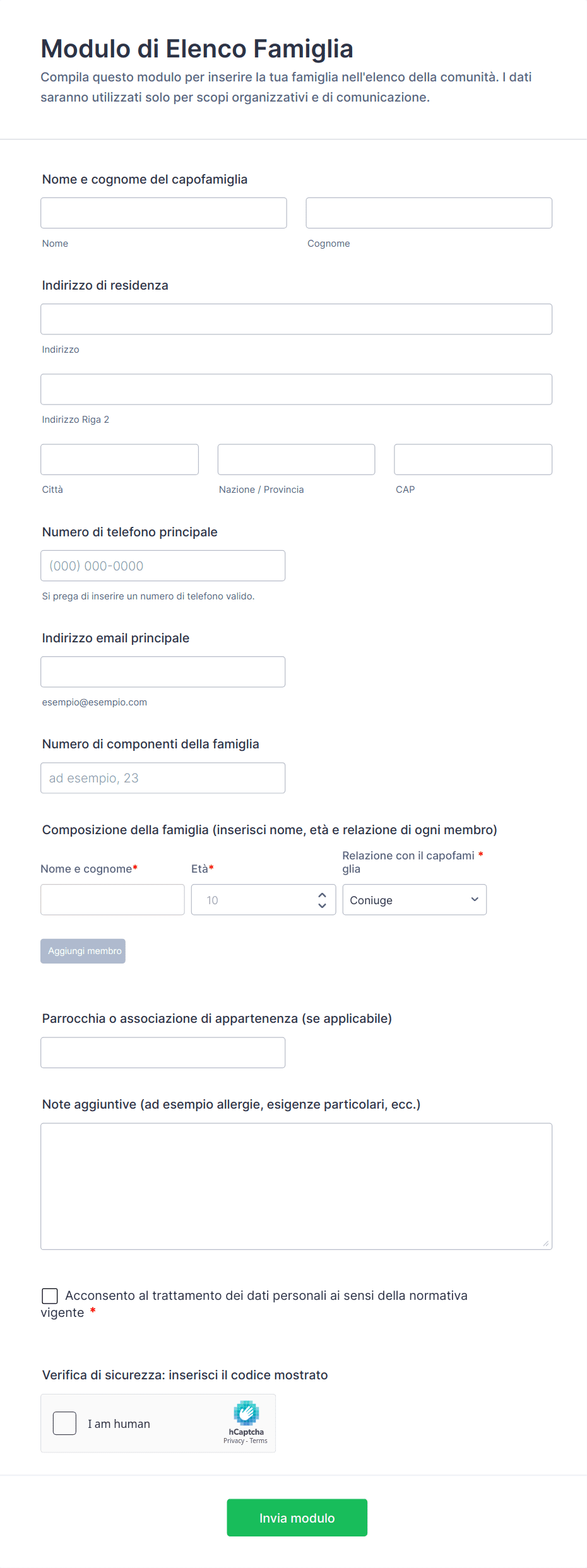 - Onboarding dei clienti: Possono includere campi per i dettagli di contatto, le preferenze di servizi e gli accordi di consenso.
