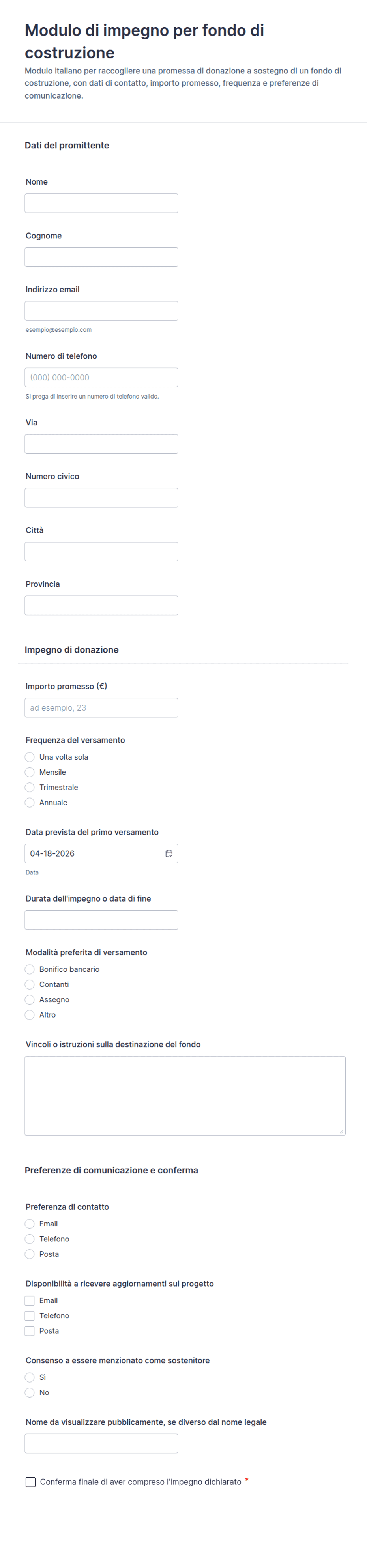 Dovrebbe includere i dati di contatto del promittente e le informazioni essenziali sull’impegno, come importo promesso, frequenza del versamento e data prevista del primo versamento, oltre alle preferenze di comunicazione e conferma finale.