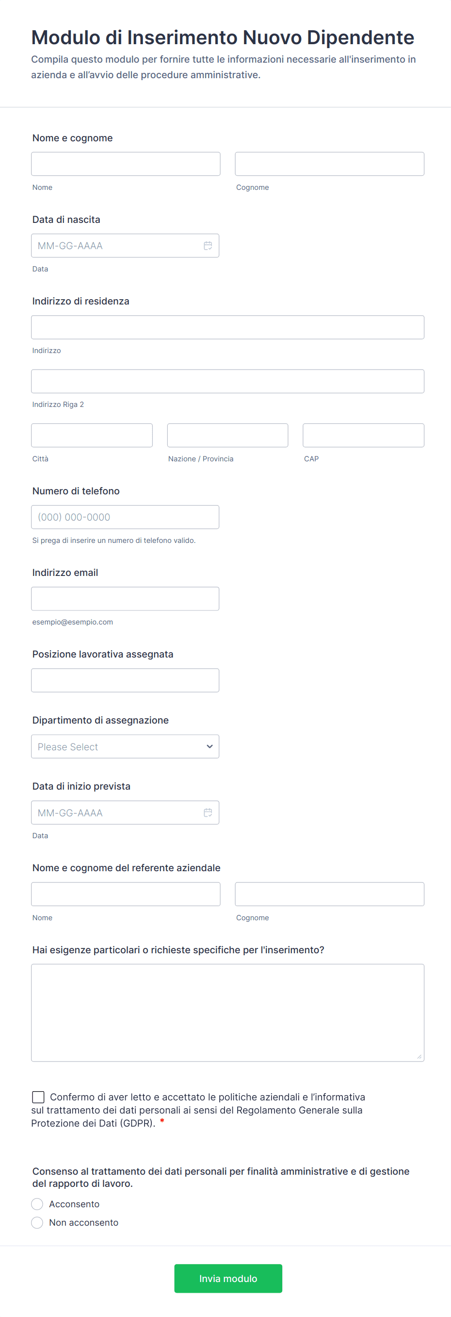 - Per l'inserimento dei dipendenti, includi campi per le informazioni personali, i contatti d'emergenza, i moduli fiscali e l'accettazione delle policy.