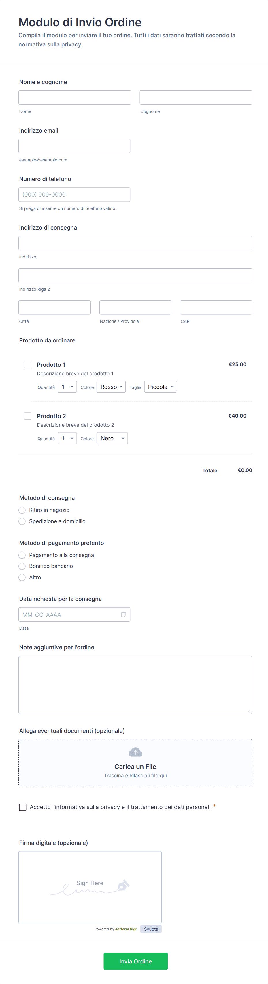 Raccogli ordini online, richieste di consegna e preferenze di pagamento con il Modulo di Invio Ordine Form di Jotform, ideale per negozi e attività locali che vogliono semplificare la raccolta dati e la gestione delle risposte.