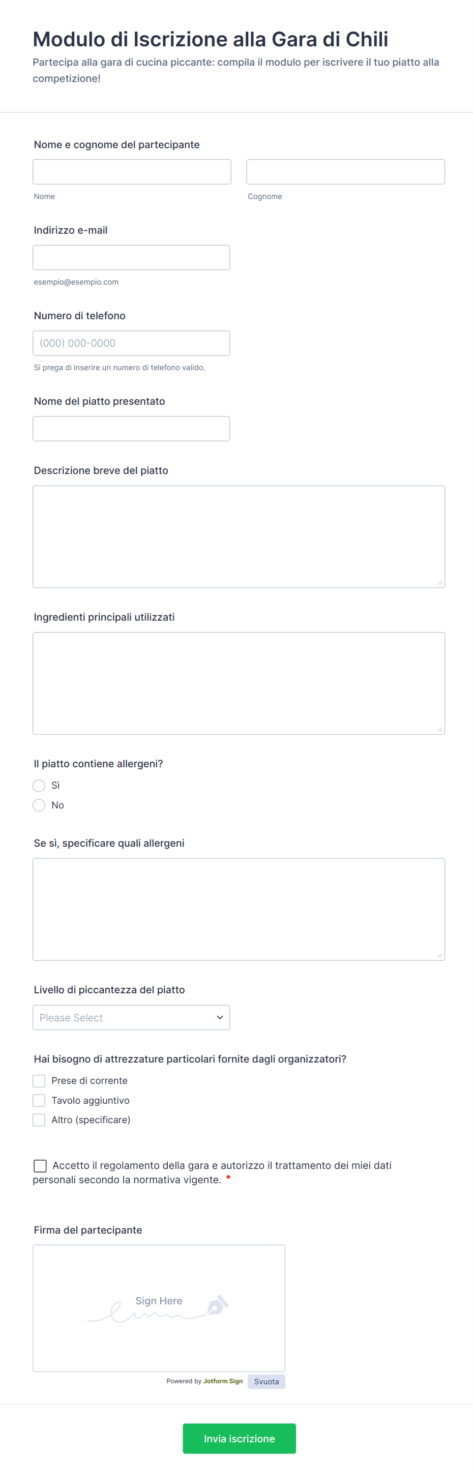 Campi comuni includono nome del partecipante, dettagli di contatto, età o data di nascita, selezione della categoria, campi di caricamento di file (se richiesto), consenso alle regole, e informazioni di pagamento per le quote di iscrizione.