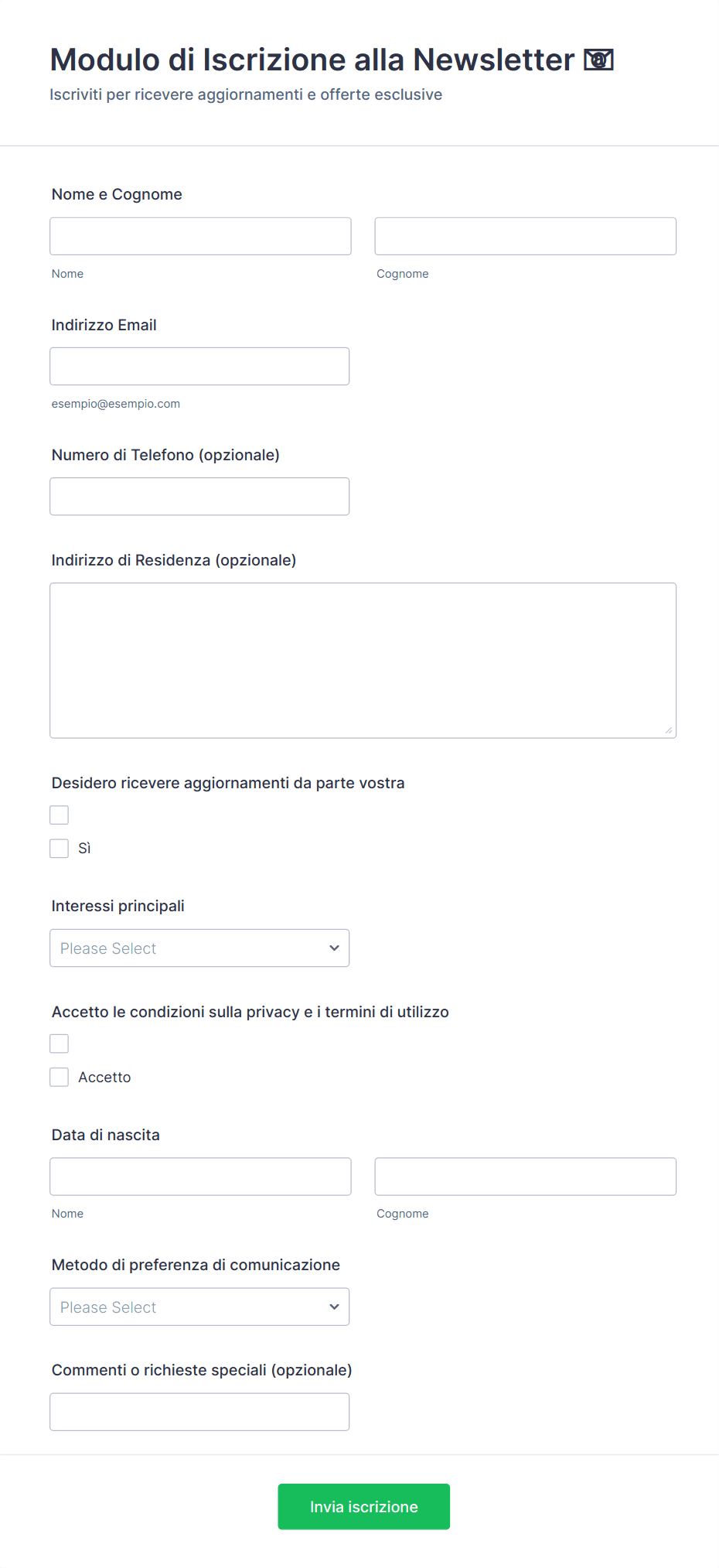 Raccogli iscrizioni alla newsletter e gestisci preferenze e consensi con il Modulo di iscrizione alla newsletter via email, ideale per aziende, associazioni e creator che vogliono migliorare la raccolta dati e le risposte.