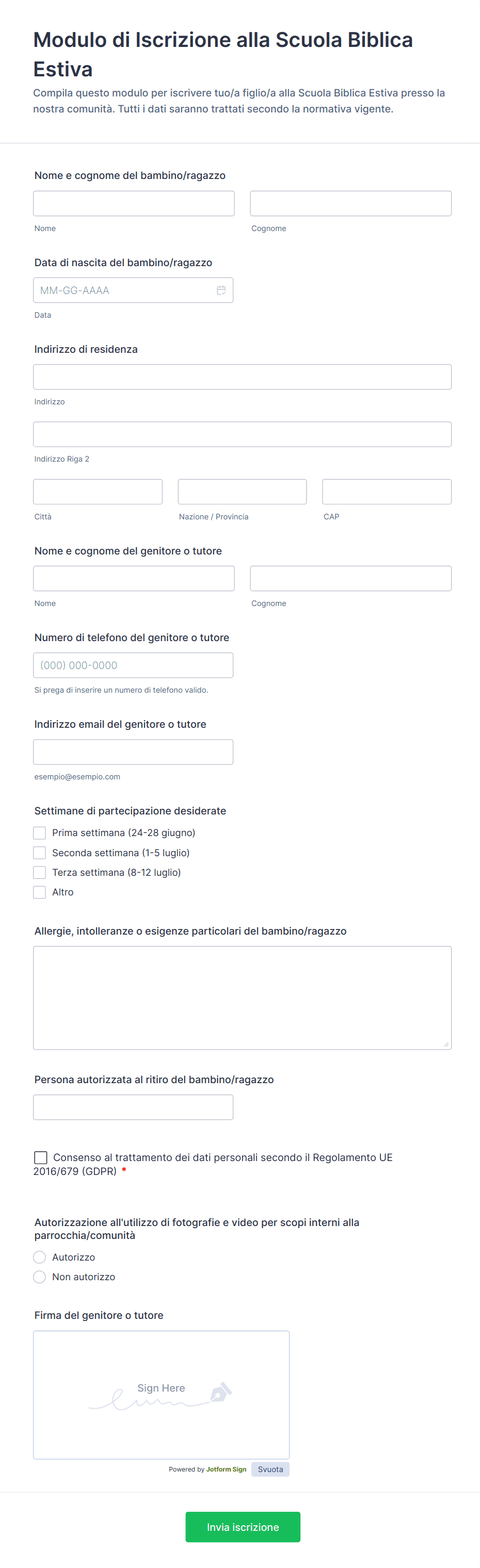- Per i campi estivi per ragazzi, includere le sezioni relative al consenso dei genitori e all'autorizzazione medica.