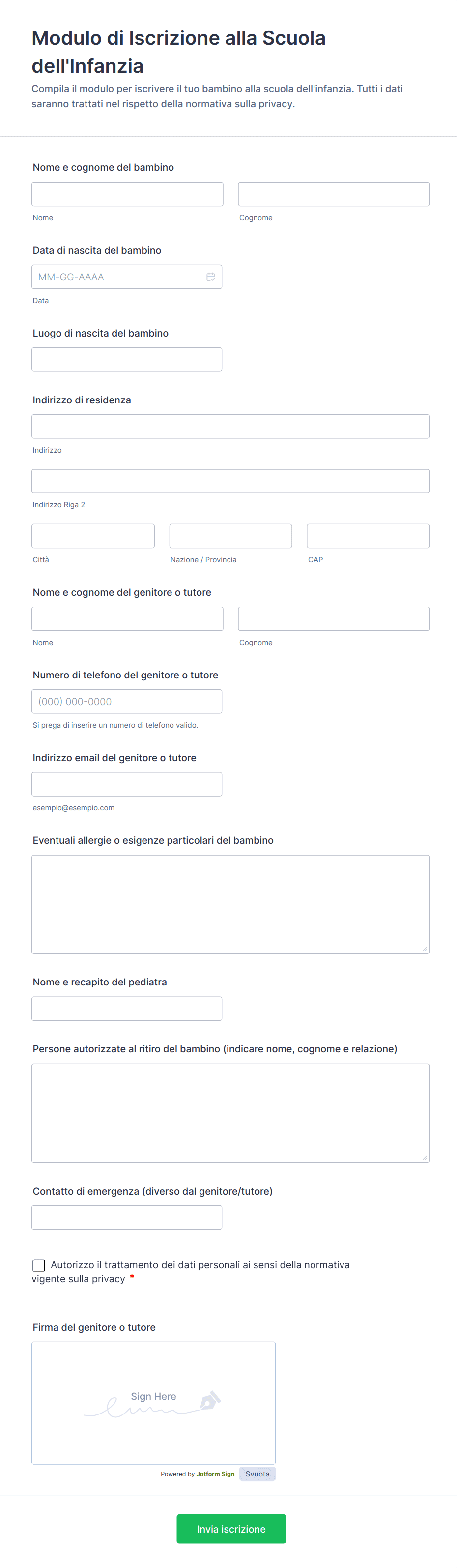 Un modulo di iscrizione scolastica è un documento o un modulo online utilizzato dalle istituzioni educative per raccogliere informazioni essenziali dagli studenti e dalle loro famiglie per l'iscrizione, il rinnovo o la partecipazione ad attività scolastiche.