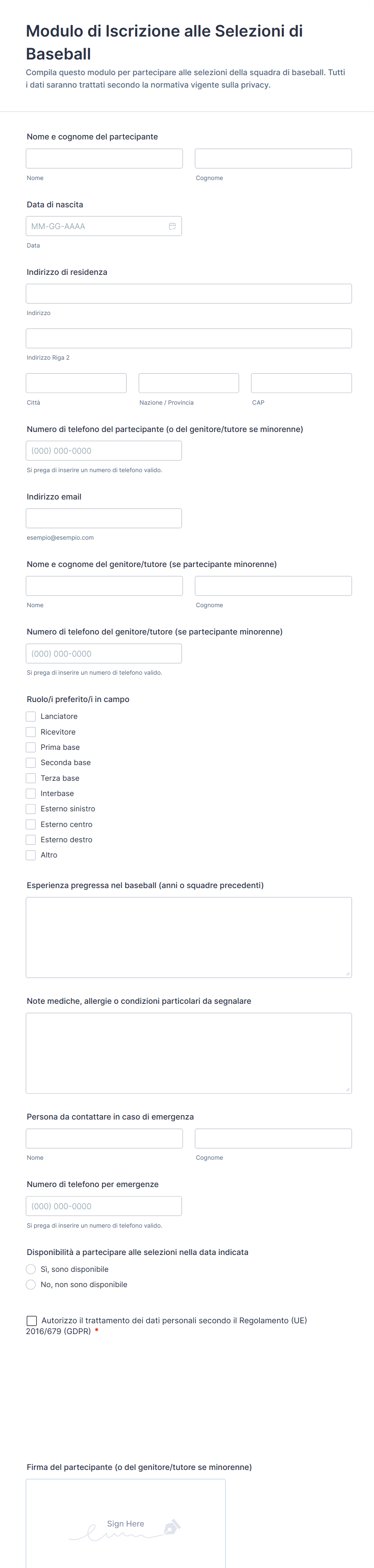 - Registrazione del Giocatore: Si concentra sui dettagli individuali, la storia medica e il consenso dei genitori per i minori.
