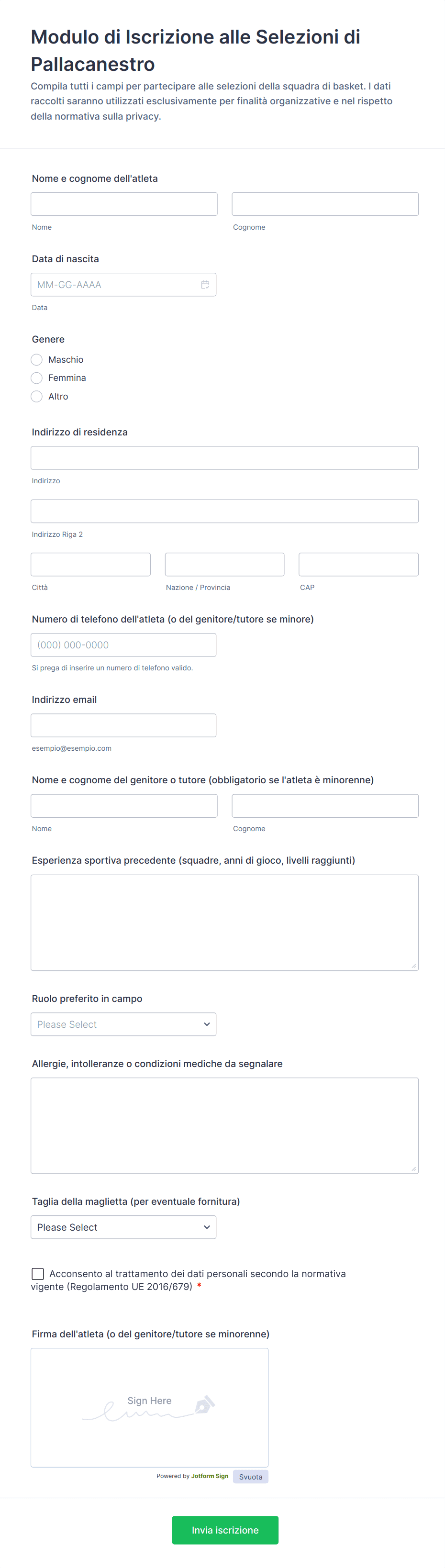 I moduli di iscrizione sportiva sono strumenti essenziali per organizzare e gestire la partecipazione ad attività atletiche, campionati, tornei e programmi di fitness. Questi moduli vengono utilizzati da club sportivi, scuole, centri comunitari e organizzatori di eventi per raccogliere informazioni importanti da atleti, allenatori e volontari. Gli usi tipici includono la registrazione di giocatori per leghe giovanili di calcio, l'iscrizione di squadre a tornei di basket, l'arruolamento di partecipanti ai bootcamp di fitness e la raccolta di consensi e dettagli di contatto d'emergenza per eventi sportivi scolastici. Semplificando il processo di registrazione, questi moduli aiutano a garantire che tutti i dati necessari, come dettagli dei partecipanti, informazioni mediche, liberatorie e pagamenti, vengano raccolti in modo efficiente e sicuro.