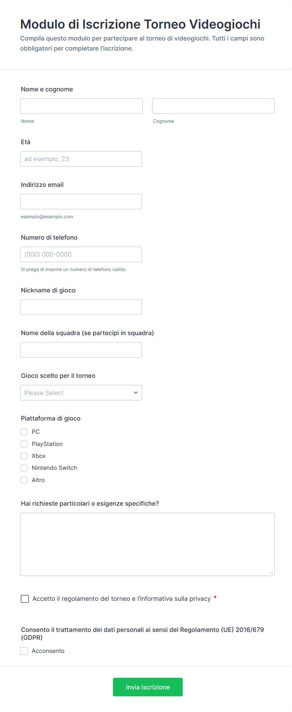 Un modulo di registrazione per eventi è utilizzato per raccogliere informazioni da persone che desiderano partecipare a un evento. Solitamente raccoglie dettagli come nomi, contatti, preferenze di pagamento e eventuali esigenze speciali.
