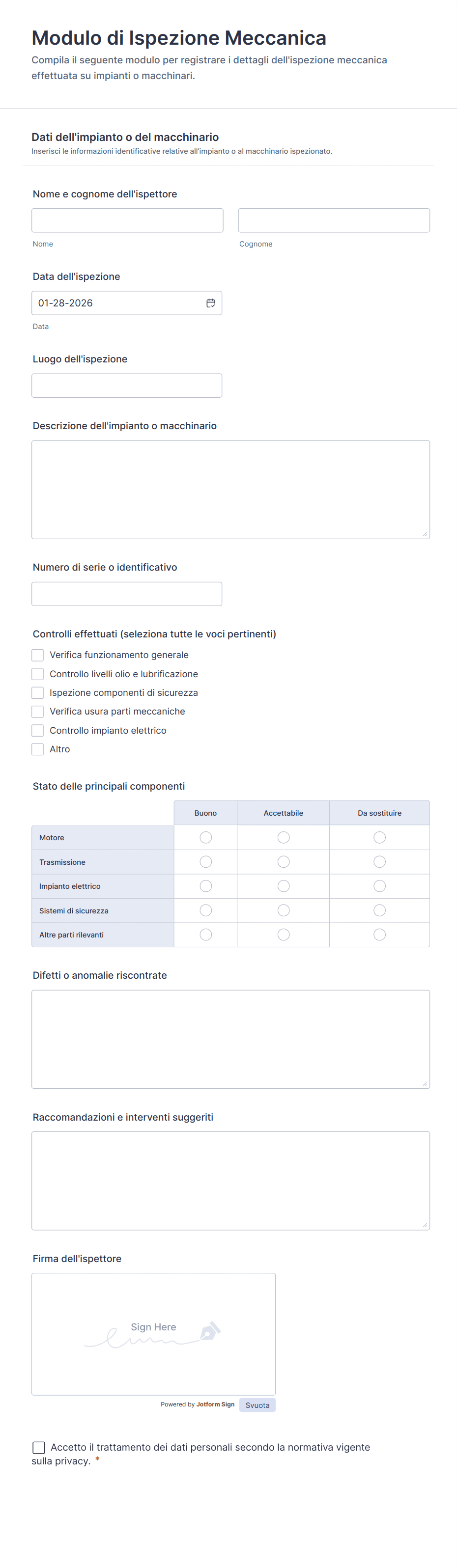 Creare un modulo di ispezione efficace e personalizzato con Jotform è semplice e intuitivo, permettendoti di soddisfare i requisiti unici del tuo processo d'ispezione. Che tu stia conducendo audit di sicurezza, controlli sulle attrezzature o sopralluoghi, la piattaforma di Jotform assicura che i tuoi moduli siano completi, facili da usare e accessibili da qualsiasi dispositivo.
