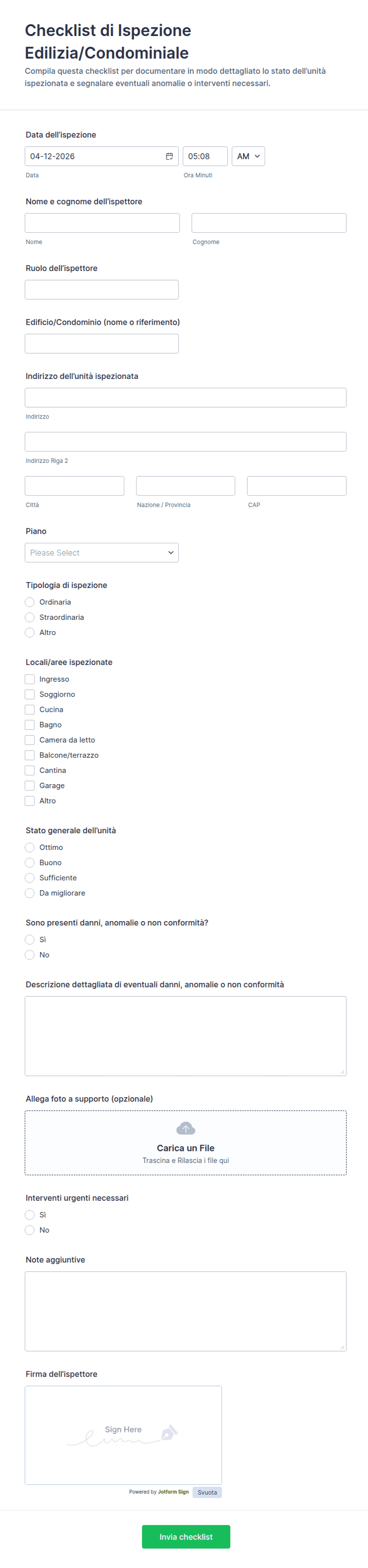 Raccogli e organizza la raccolta dati delle ispezioni di edifici e condomini con la Checklist di Ispezione Edilizia e Condominiale Form di Jotform, utile per amministratori, tecnici e gestori immobiliari che vogliono report uniformi e tracciabili.