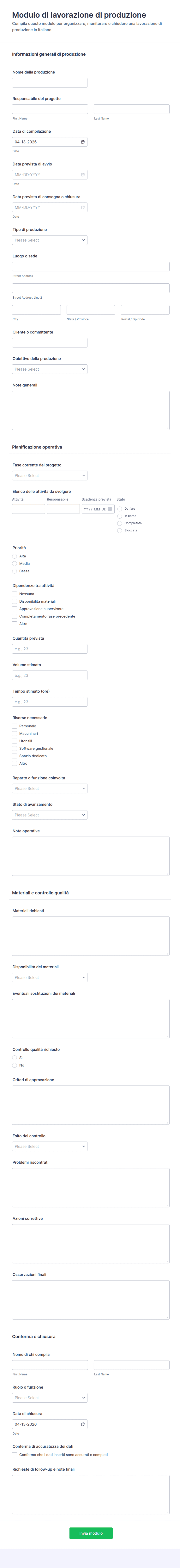 3. Quali informazioni sono tipicamente raccolte con un modulo di produzione?