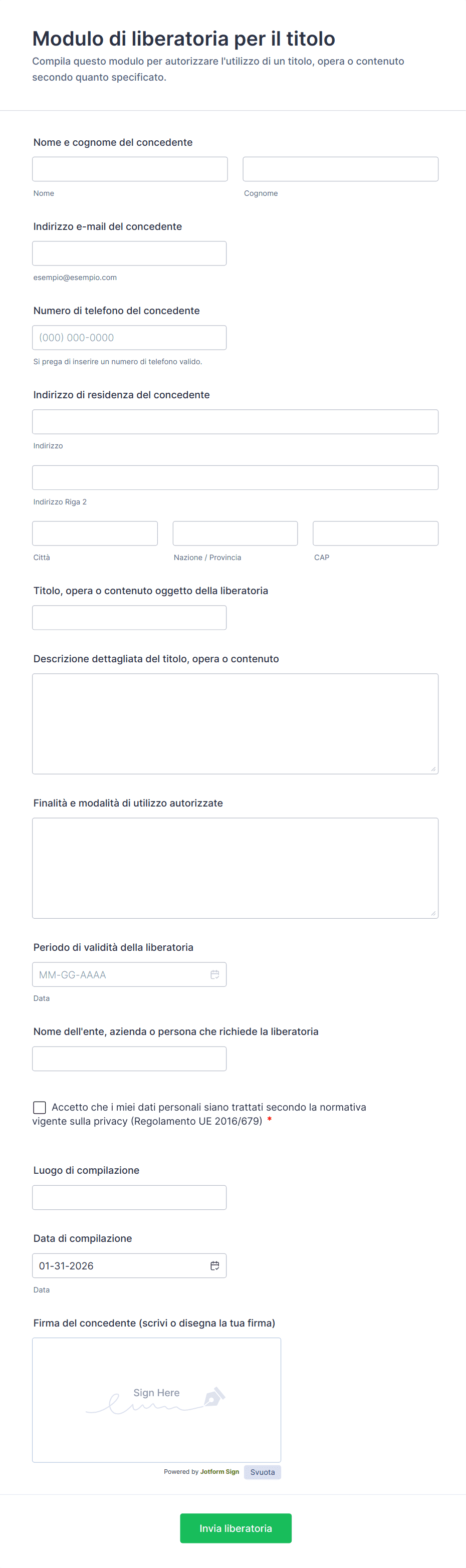 Raccogli autorizzazioni all’uso di titoli e contenuti con il Modulo di liberatoria per il titolo di Jotform, ideale per editoria, comunicazione ed eventi, con condivisione rapida e gestione ordinata della raccolta dati.