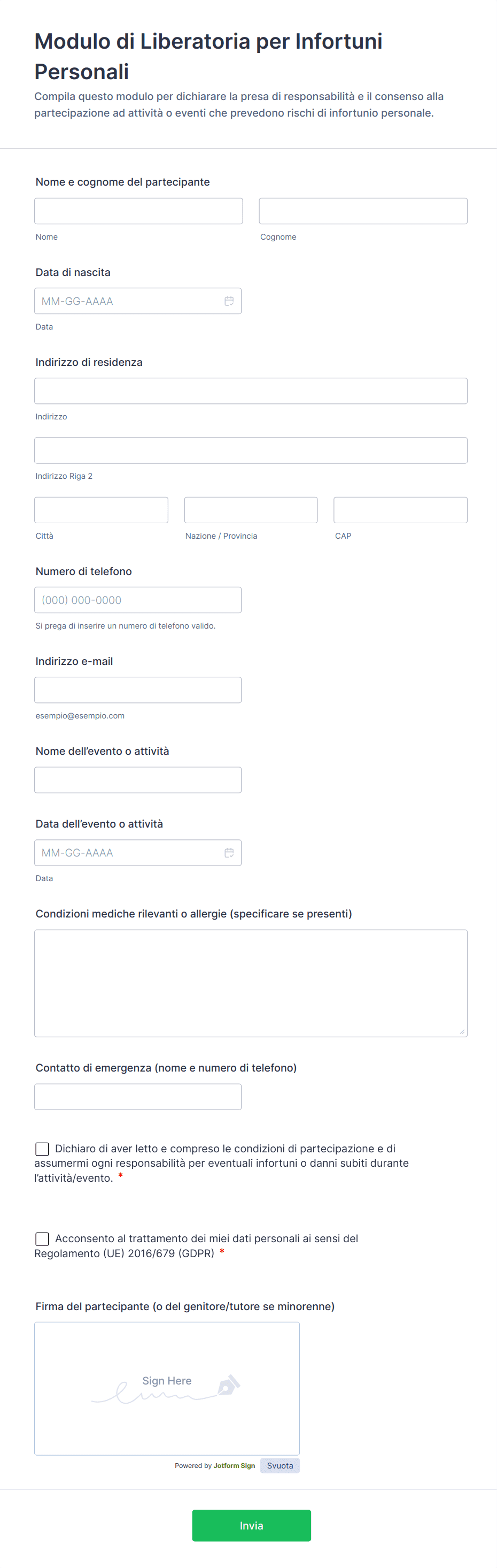 Raccogli liberatorie per eventi e attività con il Modulo di Liberatoria per Infortuni Personali, utile per associazioni, palestre e organizzatori che vogliono gestire la raccolta dati e le risposte in modo ordinato.
