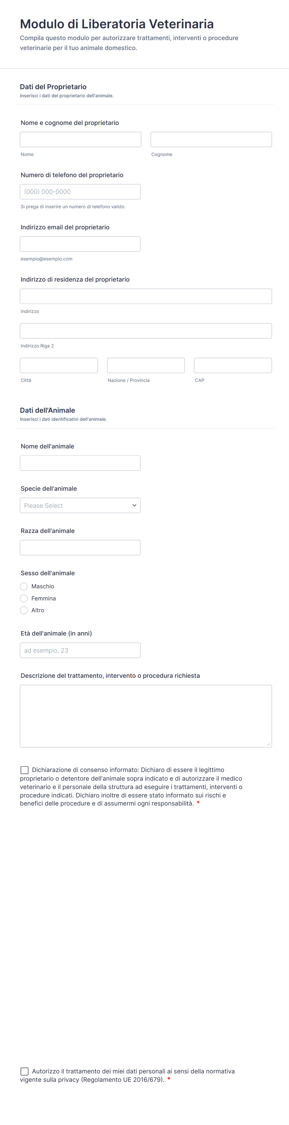 Si usa per raccogliere il consenso del proprietario prima di trattamenti o procedure veterinarie e per conservare una registrazione chiara dell’autorizzazione insieme ai dati necessari per la gestione del caso.