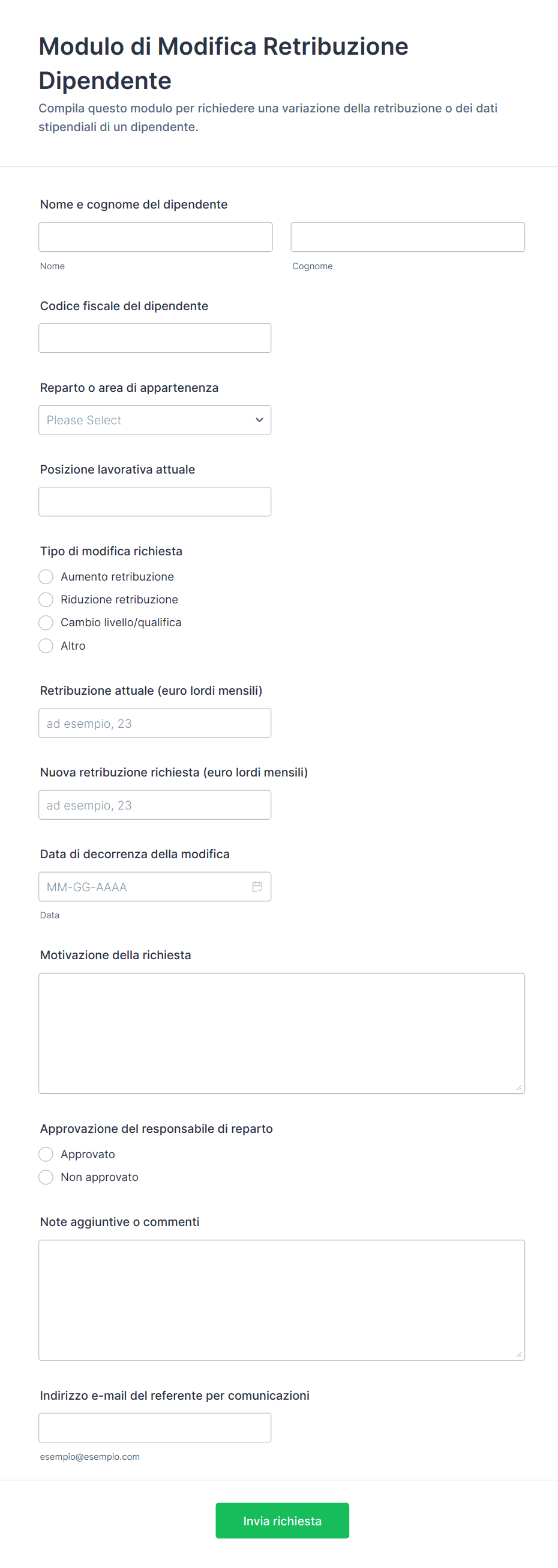 - Modifiche al libro paga: Potrebbero richiedere campi per la matricola del dipendente, il periodo di pagamento, il tipo di modifica e la documentazione di supporto.