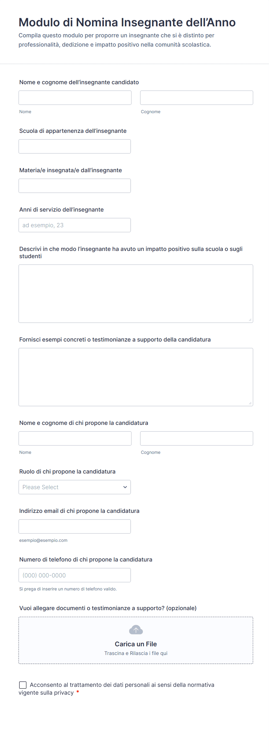 Raccogli candidature per il riconoscimento Insegnante dell’Anno con un modulo pronto per scuole e comitati, utile per valutare le segnalazioni in modo coerente e organizzare la raccolta dati con Jotform.