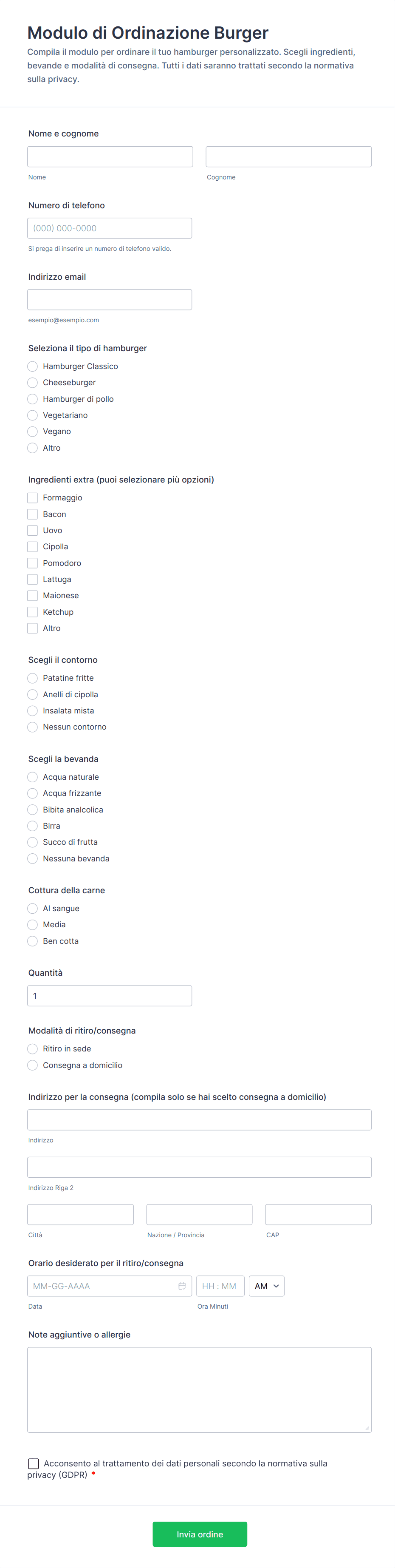 - Ordini del ristorante: i moduli possono includere la selezione degli articoli del menù, modificatori (ad esempio, dimensioni, condimenti), indirizzo di consegna e integrazione del pagamento.