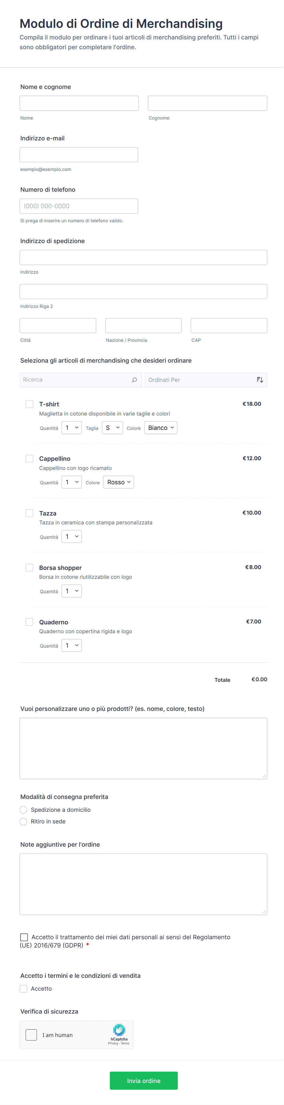 Un modulo d'ordine è un modulo online utilizzato per raccogliere gli ordini dei clienti per beni o servizi, comprese le selezioni dei prodotti, le quantità, i dettagli di pagamento e di consegna.