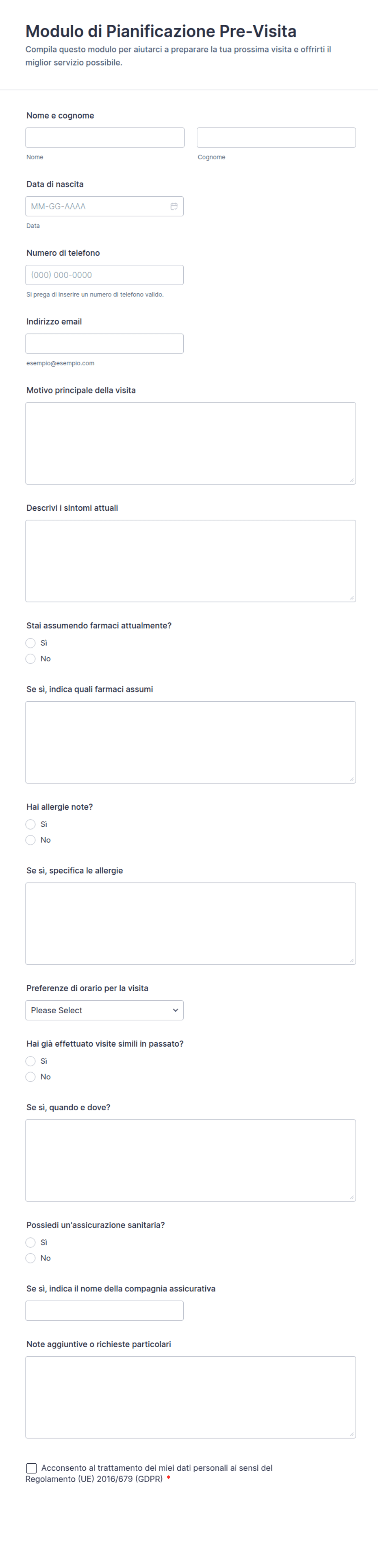 • I moduli di accettazione sanitaria possono richiedere campi per la storia clinica, le allergie e l'assicurazione.