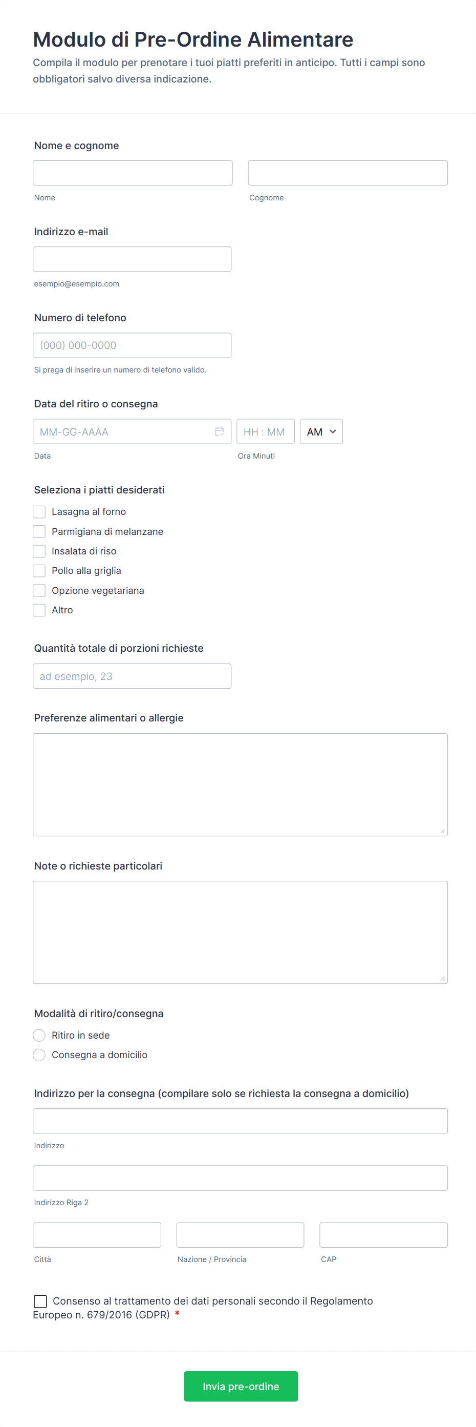- I preordini di cibo potrebbero richiedere opzioni di ritiro/consegna, preferenze alimentari e campi per la quantità dell'ordine.