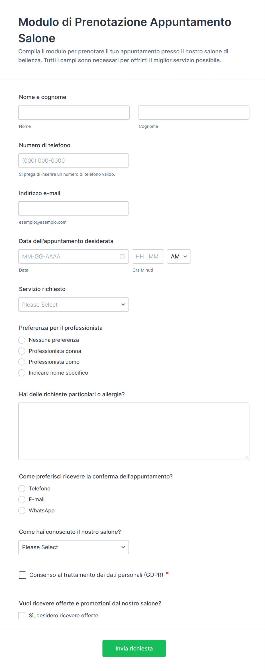 I moduli dei saloni di bellezza aiutano a semplificare le operazioni, ridurre la burocrazia, minimizzare gli errori di prenotazione e garantire che tutte le informazioni necessarie vengano raccolte per un'esperienza cliente sicura e personalizzata.