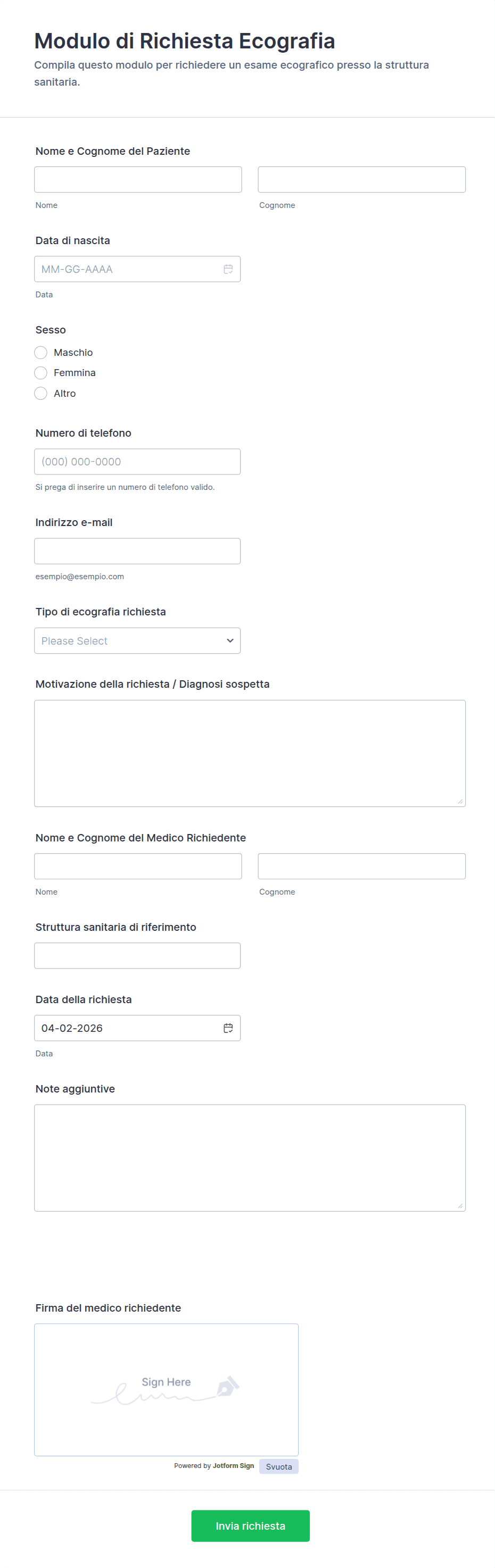 Inizia scegliendo uno dei nostri modelli sanitari o inizia a personalizzare il tuo. Inoltre, Jotform offre un modo semplice per aggiornare la storia medica, acquisire il consenso firme elettroniche, riscuotere pagamenti, trovare nuove opportunità di business e altro ancora. Jotform offre anche funzionalità di conformità HIPAA in modo che i tuoi moduli sanitari rimangano al sicuro.