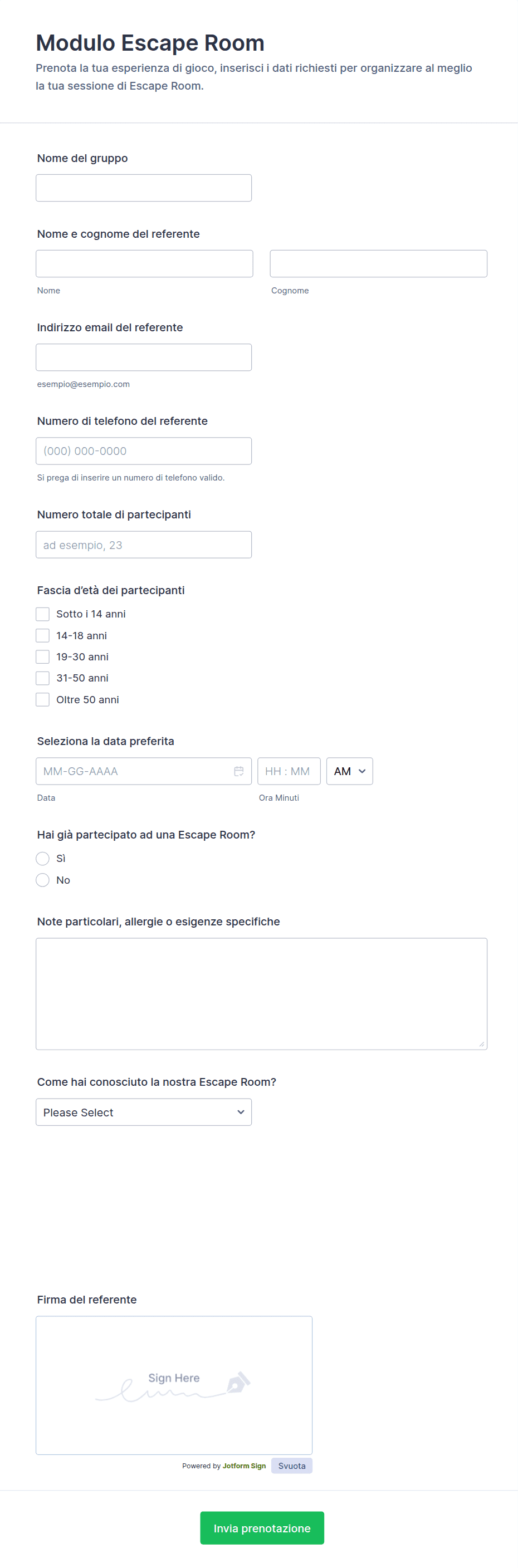 Campi tipici includono nome del partecipante, dettagli di contatto, data/ora dell'evento, numero di biglietti, informazioni sul pagamento ed eventuali richieste o preferenze speciali.