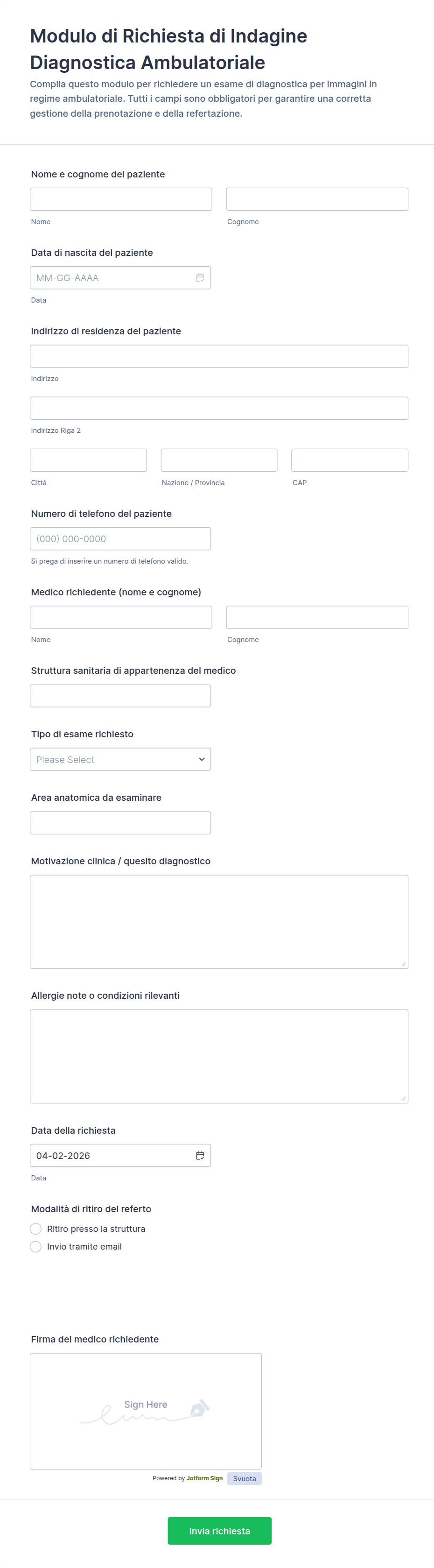 Inizia scegliendo uno dei nostri modelli sanitari o inizia a personalizzare il tuo. Inoltre, Jotform offre un modo semplice per aggiornare la storia medica, acquisire il consenso firme elettroniche, riscuotere pagamenti, trovare nuove opportunità di business e altro ancora. Jotform offre anche funzionalità di conformità HIPAA in modo che i tuoi moduli sanitari rimangano al sicuro.