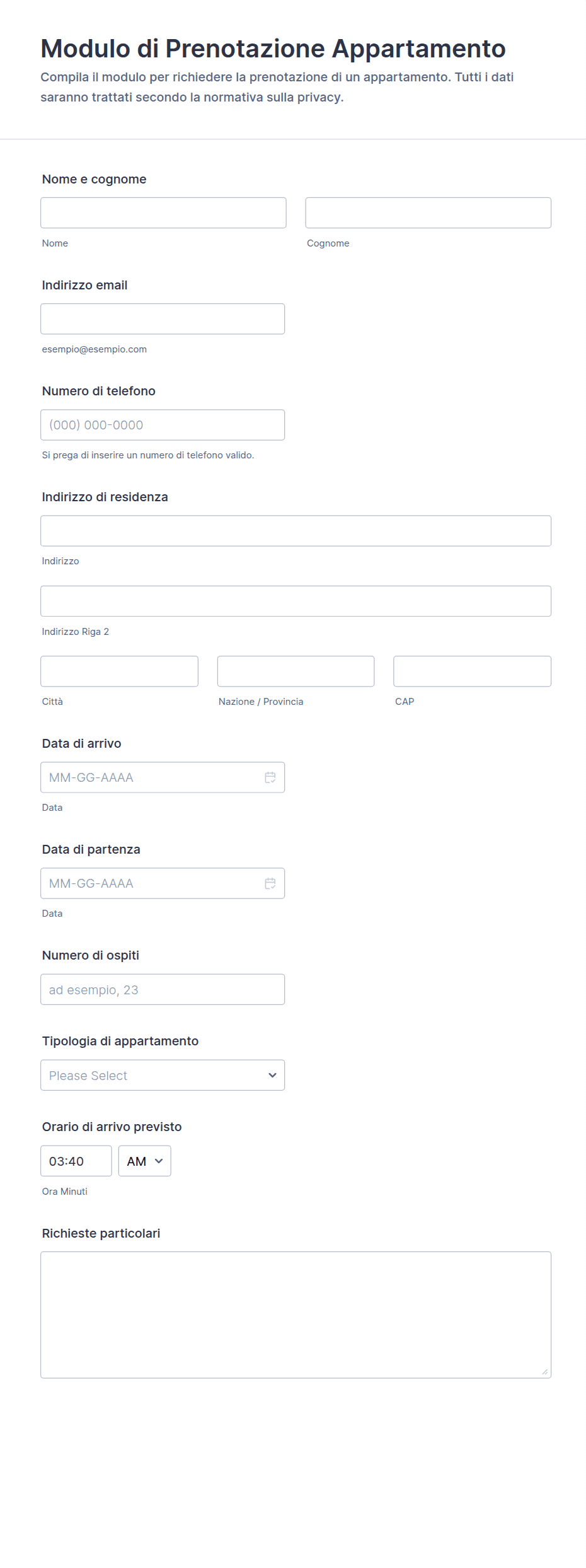 I moduli di prenotazione sono strumenti digitali progettati per semplificare il processo di prenotazione di servizi, spazi o articoli. Sono comunemente utilizzati da aziende e organizzazioni per gestire appuntamenti, registrazioni a eventi, prenotazioni di tavoli, affitti di strutture, soggiorni in hotel, prestiti di attrezzature e altro ancora. Raccogliendo informazioni essenziali come nomi, recapiti, date e orari preferiti e requisiti specifici, i moduli di prenotazione contribuiscono a garantire un processo di pianificazione fluido e organizzato. Che gestiate un ristorante, un hotel, una clinica, una sede per eventi o un servizio di noleggio, i moduli di prenotazione possono ridurre significativamente il coordinamento manuale e ridurre al minimo le doppie prenotazioni o i conflitti di programmazione.