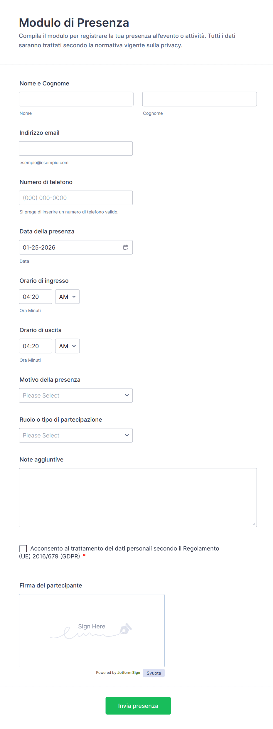 I modelli di modulo di presenza sono moduli digitali utilizzati per tracciare, registrare e gestire la presenza per una varietà di eventi, attività e organizzazioni. Che tu stia organizzando una lezione, una sessione di formazione aziendale, un evento comunitario o un programma di volontariato, questi modelli aiutano a semplificare il processo di raccolta delle informazioni dei partecipanti e di monitoraggio delle presenze. I moduli di presenza possono essere adattati per check-in giornalieri, registrazioni a eventi, tracciamento del tempo dei dipendenti o anche per la verifica della presenza a distanza, rendendoli strumenti versatili per educatori, professionisti delle risorse umane, coordinatori di eventi, e team leader.