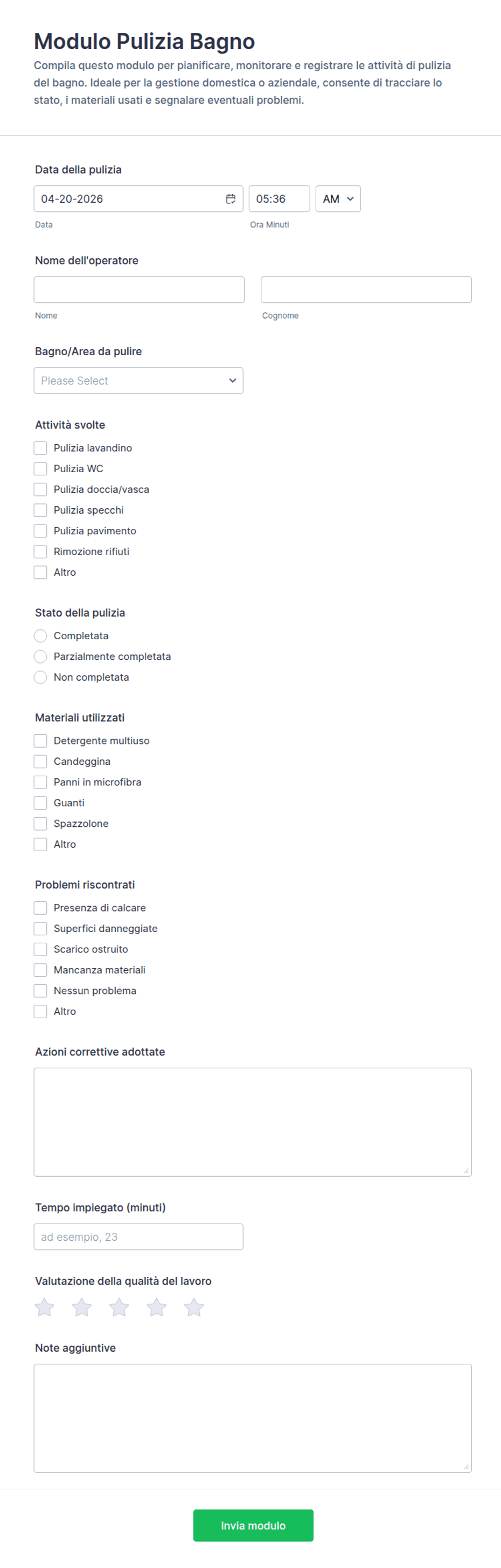 3. Quali informazioni sono tipicamente incluse in un modulo sulla pulizia?