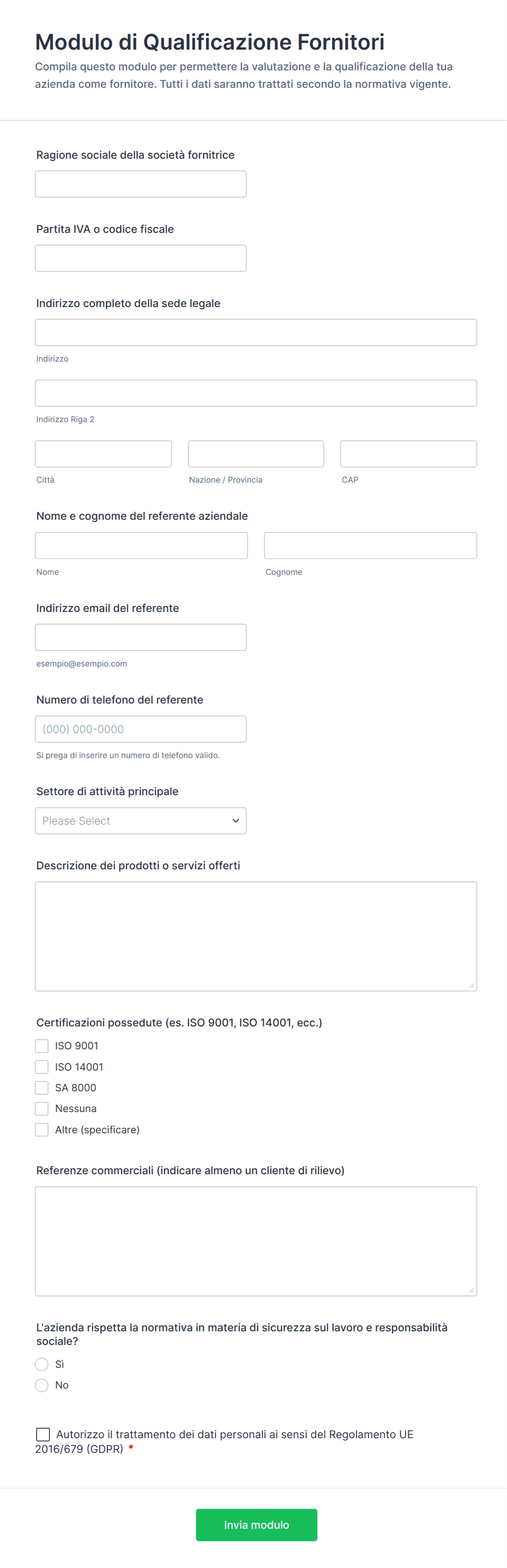 - I moduli di onboarding e registrazione dei fornitori si concentrano sui dettagli dell'azienda, sulle categorie di prodotti o servizi, sui contatti, sulle informazioni bancarie e fiscali e sui caricamenti della documentazione richiesta.