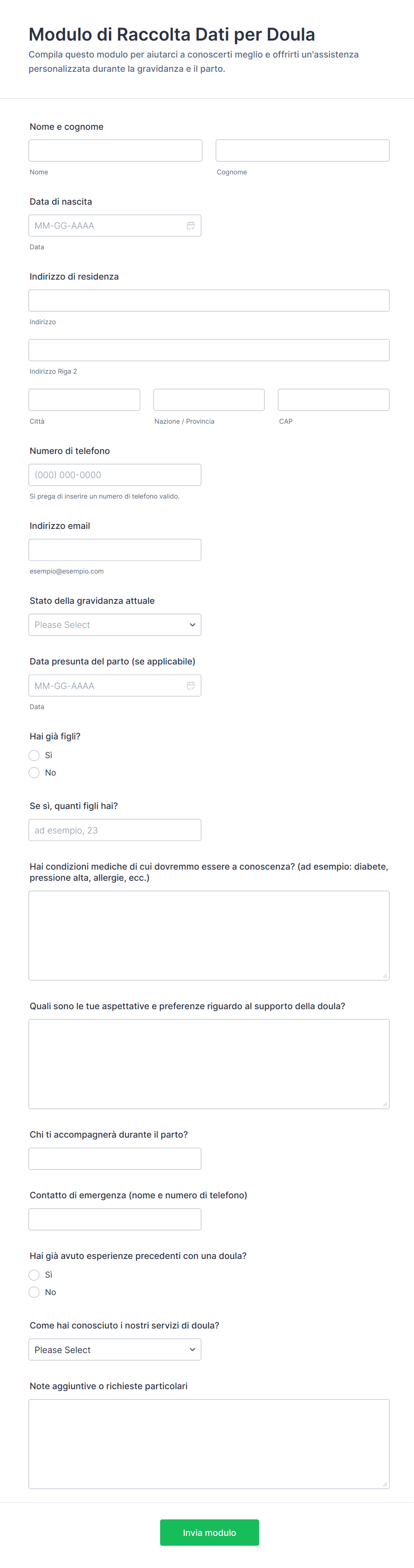 I moduli di acquisizione sono strumenti essenziali utilizzati per raccogliere informazioni preliminari da clienti, pazienti, clienti o partecipanti prima di fornire un servizio o iniziare un processo. Questi moduli semplificano il processo di onboarding raccogliendo dettagli rilevanti come informazioni di contatto, dati di background, preferenze e necessità specifiche. I moduli di acquisizione sono ampiamente utilizzati in vari settori, tra cui sanità (registrazione pazienti), legale (inserimento clienti), istruzione (registrazione studenti), risorse umane (inserimento dipendenti) e aziende basate sui servizi (consulenze clienti). Standardizzando il processo di raccolta delle informazioni, i moduli di inserimento aiutano le organizzazioni a garantire coerenza, migliorare l'efficienza e offrire esperienze personalizzate.