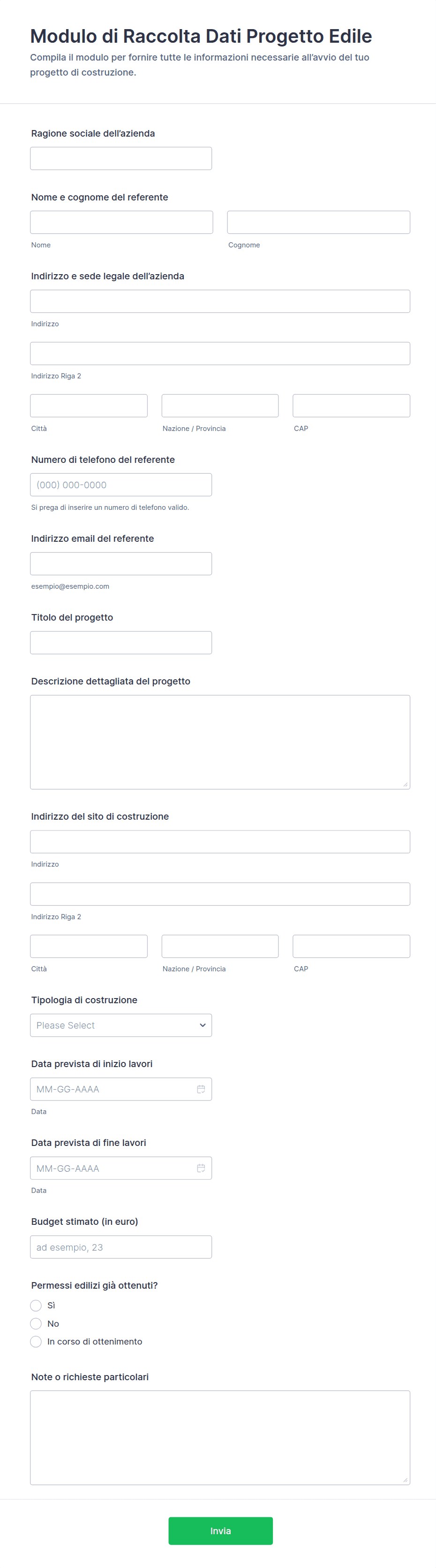 Un modulo di costruzione è un documento digitale o cartaceo utilizzato per raccogliere, registrare e gestire informazioni relative ai progetti edili, come ordini di lavoro, ispezioni di sicurezza, rapporti giornalieri ed elenchi di controllo delle attrezzature.