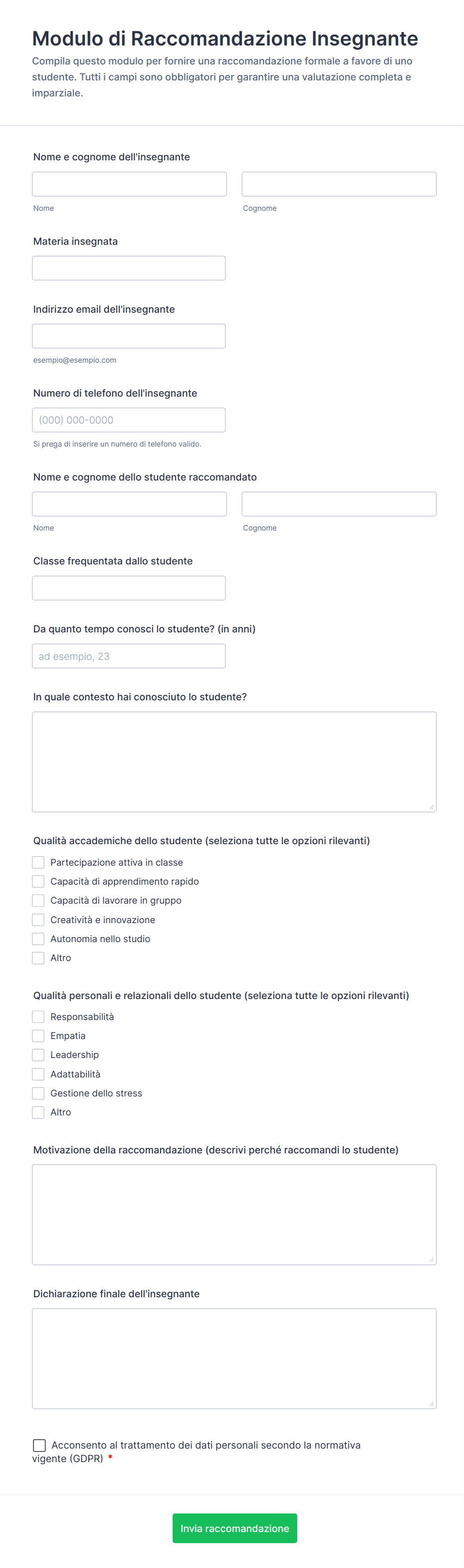 Campi comuni includono i dettagli di contatto di chi fa la raccomandazione, la relazione con il richiedente, valutazioni su abilità o attributi specifici e commenti a risposta aperta.