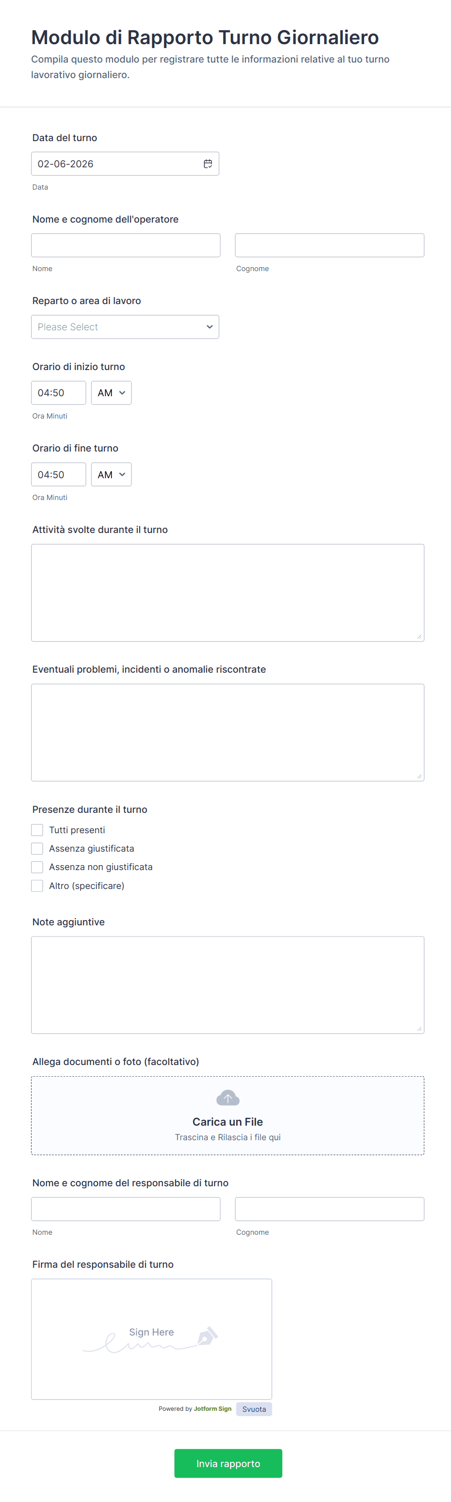 Un modulo di rapporto del turno è un documento utilizzato per registrare e comunicare informazioni importanti durante il cambio di turno, garantendo continuità e responsabilità tra il personale uscente e quello in arrivo.