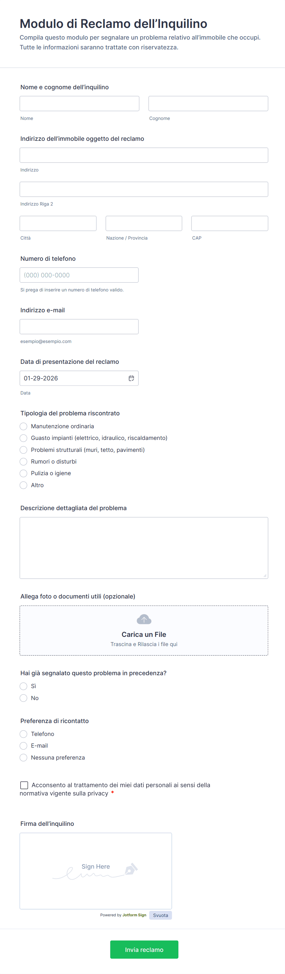 Campi tipici includono i dettagli di contatto del denunciante, la data e l'ora dell'incidente, una descrizione dettagliata del problema, la documentazione pertinente e la risoluzione preferita.