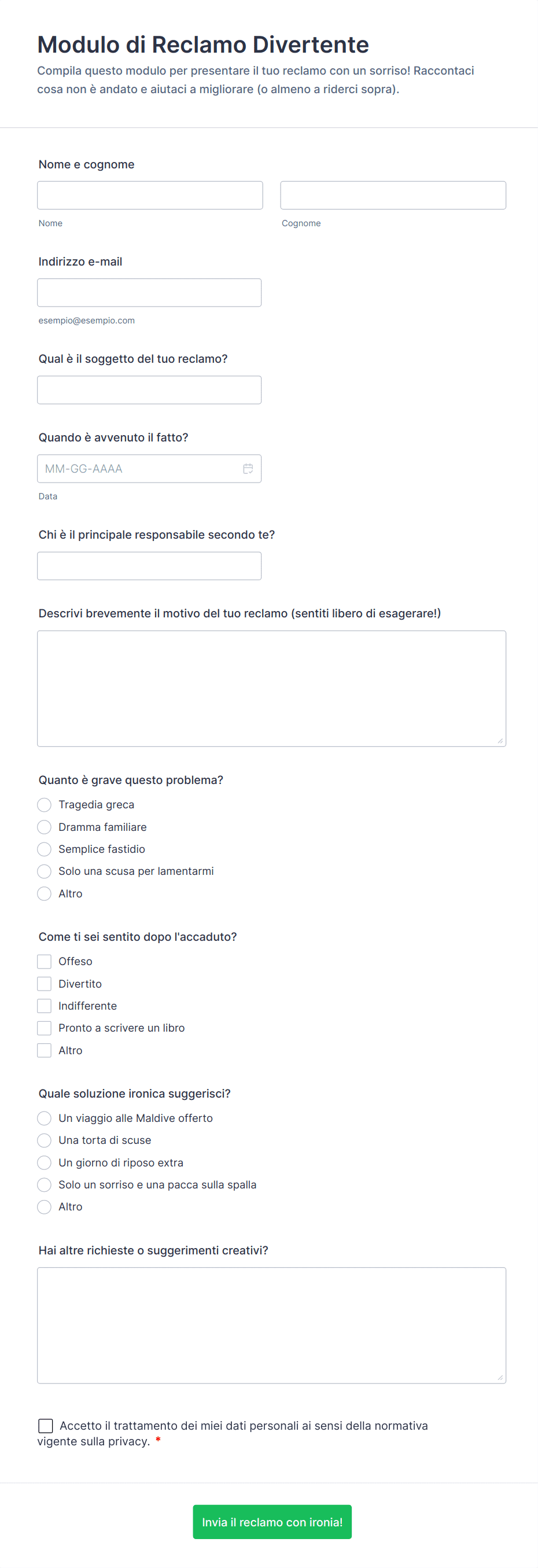 I moduli di reclamo offrono un canale formale per consentire alle persone di esprimere preoccupazioni, aiutano le organizzazioni a monitorare e risolvere i problemi in modo efficiente e contribuiscono al miglioramento dei servizi o dei processi.