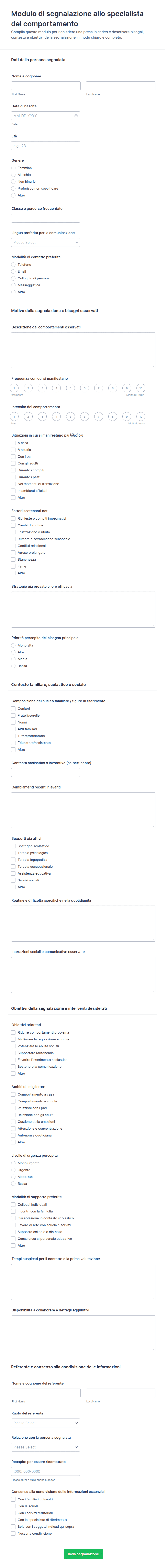 - Per le segnalazioni sulla salute mentale o servizi sociali, includi valutazioni comportamentali, necessità di supporto e accordi di riservatezza.