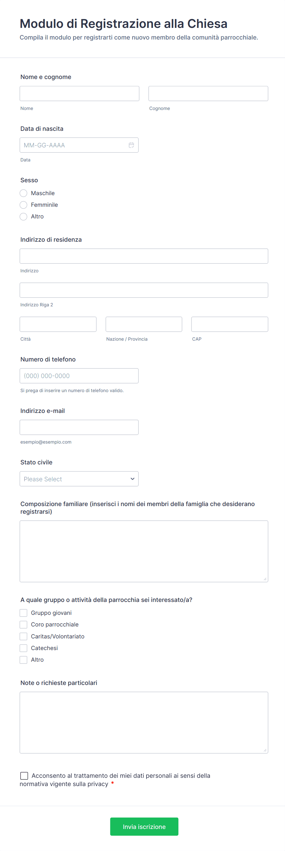 Un modello di modulo per le chiese è un modulo online già pronto, che aiuta le chiese a raccogliere e gestire informazioni per varie attività, come registrazioni agli eventi, donazioni, iscrizioni di volontari e richieste di preghiere.