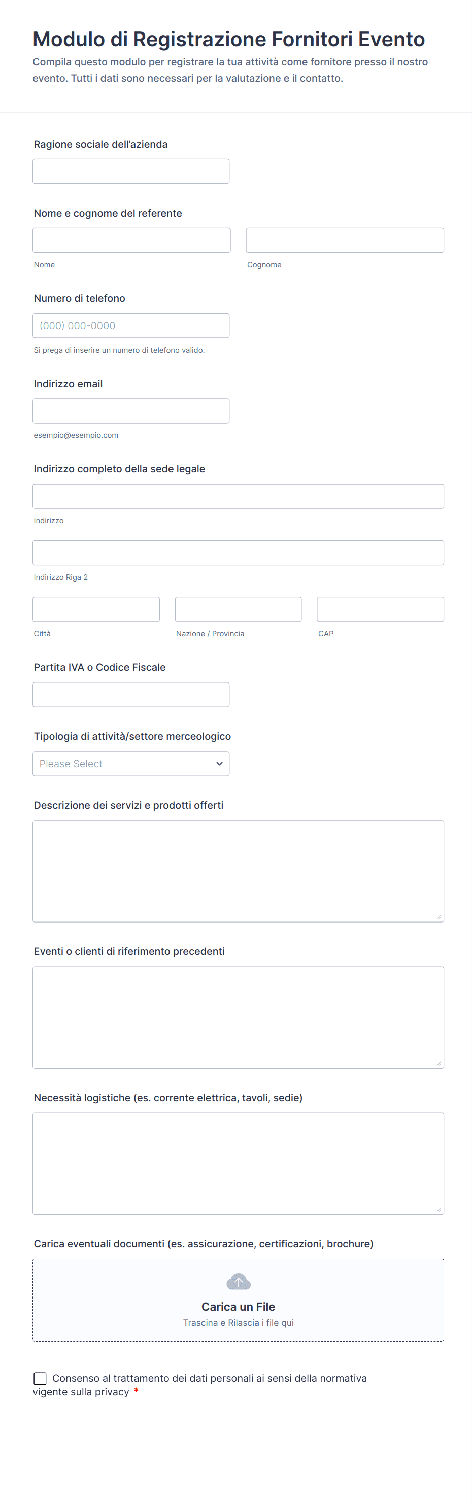 - Per i fornitori di eventi, includere campi per le preferenze relative agli stand, alle attrezzature necessarie e alle esigenze particolari.