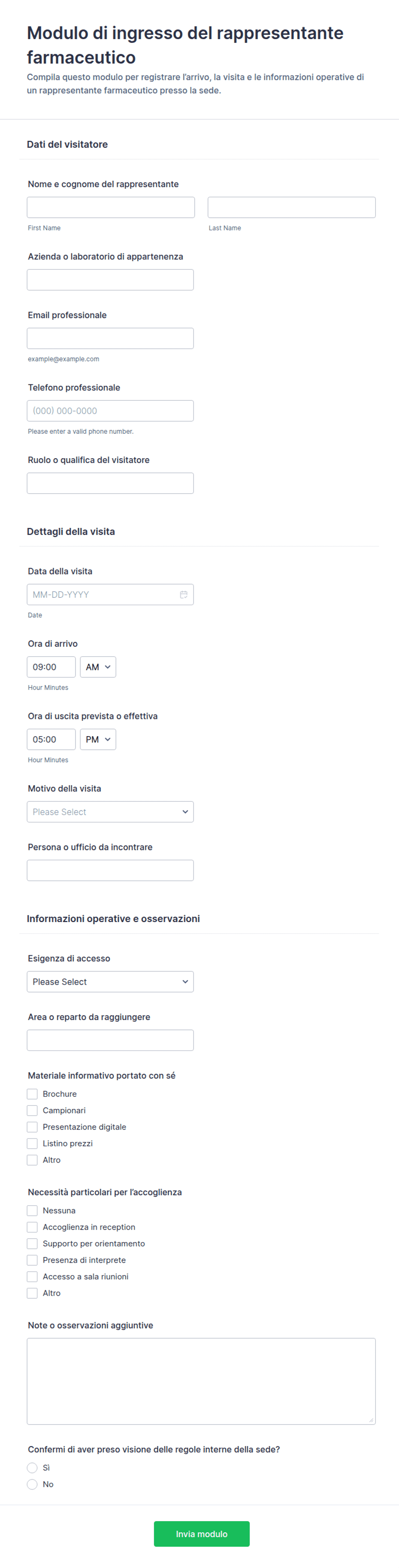 Raccogli e gestisci gli accessi in sede con il Modulo di Registrazione Visitatori di Jotform, ideale per reception e controllo accessi in uffici e strutture che vogliono una raccolta dati ordinata e consultabile.
